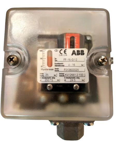 سوییچ فشار (Pressure Switch) مدل FF-16-G1/2 محصول ABB هم برای نظارت بر فشار و هم برای کارهای کنترلی در کاربردهای صنعتی و دریایی استفاده می شود. این محصول توسط Germanischer Lloyd (GL)، برای ایمنی دریایی تأیید شده است.